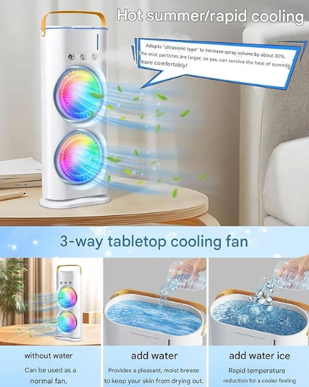 ⚡Multi-Function Cooling Fan】This 2025 summer advanced tabletop cooling fan combines 3 functions as a powerful blower that moisturizes the air in the room, and rapid cooling. Fill the water tank with water and ice to produce a refreshing cool air rapidly. The ultrasonic waves produce delicate mist that is cooler than a cold fan and does not get cold as an air conditioner. It maintains a sufficient amount of air and has a humidification effect, providing a cool and comfortable air conditioning experience and moisturizing effect for the humidifier. Recommended for those who don't like coolers or those who are concerned about drying.
