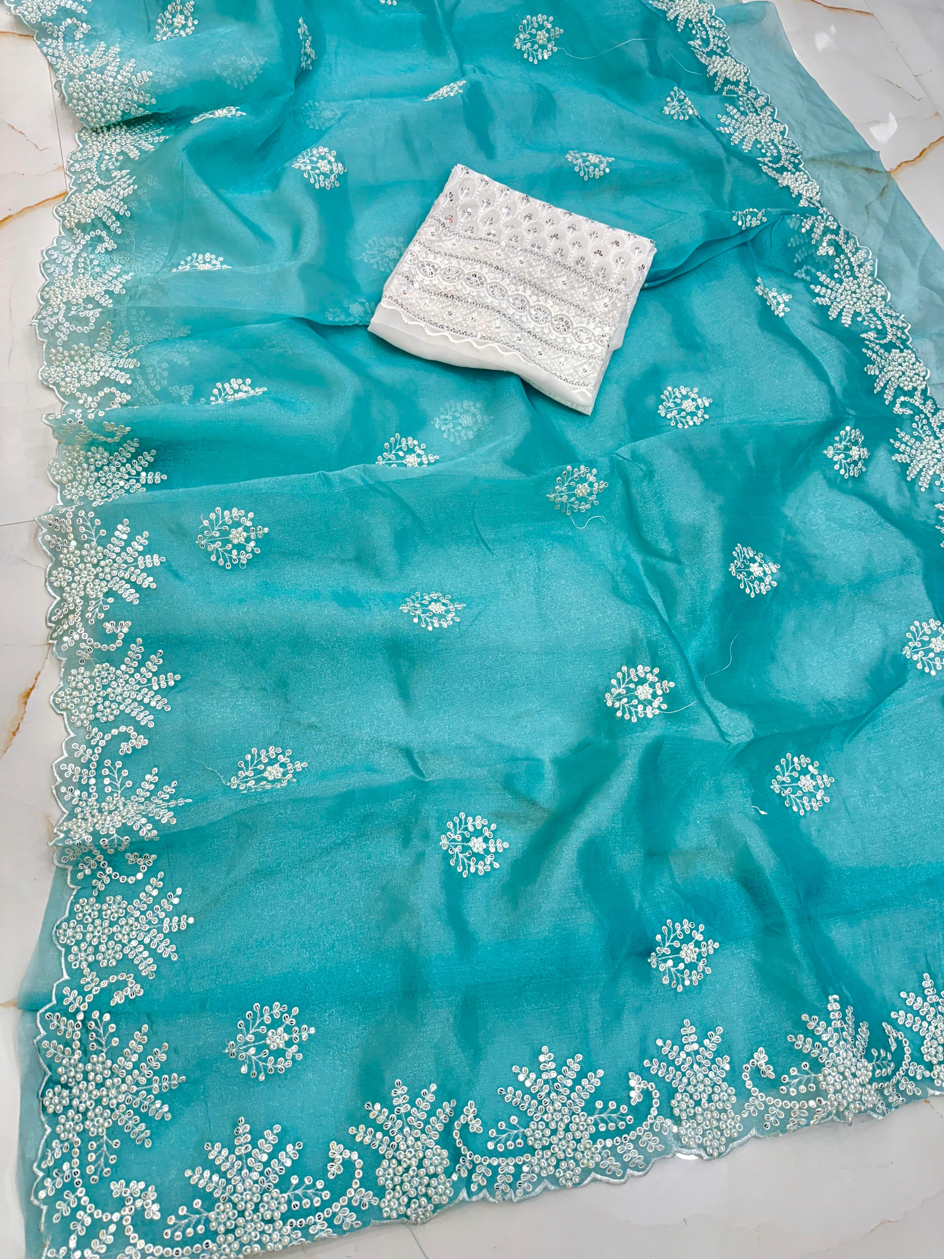 Step into a world of timeless elegance with our stunning Fendy Silk Saree. This piece is a true work of art, featuring intricate and delicate embroidery that will make you the center of attention at any event.Crafted from premium Fendy Silk, the saree drapes beautifully, offering a lightweight and comfortable feel. The exquisite design showcases a cascade of white pearl and sequin work, meticulously arranged to form a captivating floral and hakoba pattern. The rich embroidery adorns the border and pallu, creating a luxurious and graceful look.This saree comes complete with a matching blouse piece featuring the same beautiful hakoba design, allowing you to create a perfectly coordinated and stylish outfit just like the catalogue.Key Features:Fabric: High-quality Fendy SilkWork: Intricate Pearl and Sequin EmbroideryDesign: Hakoba-inspired patternBlouse: Unstitched blouse piece with matching designColor: Beautiful light blue/sea green shadeOccasion: Perfect for weddings, parties, festivals, and special occasions.