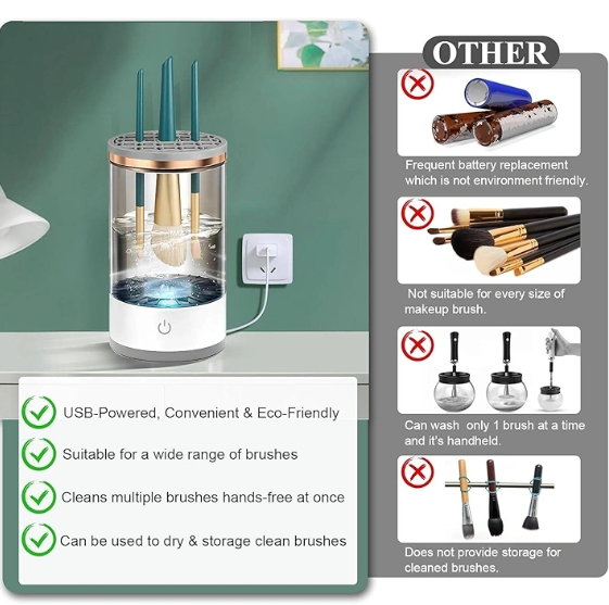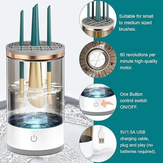Keep your makeup brushes spotless and your skin healthy with our Automatic Spinning Makeup Brush Cleaner. Designed to fit brushes of all sizes, this innovative cosmetic brush cleaner uses high-speed spinning technology to thoroughly clean and dry your brushes in just seconds. It effortlessly removes makeup residue, oil, dirt, and bacteria, helping to extend the life of your brushes while ensuring flawless makeup application every time. Easy to use and assemble, this brush cleaner is perfect for beauty enthusiasts and professionals alike. Say goodbye to time-consuming manual cleaning and hello to a quick, hygienic, and efficient solution for keeping your brushes in top condition.