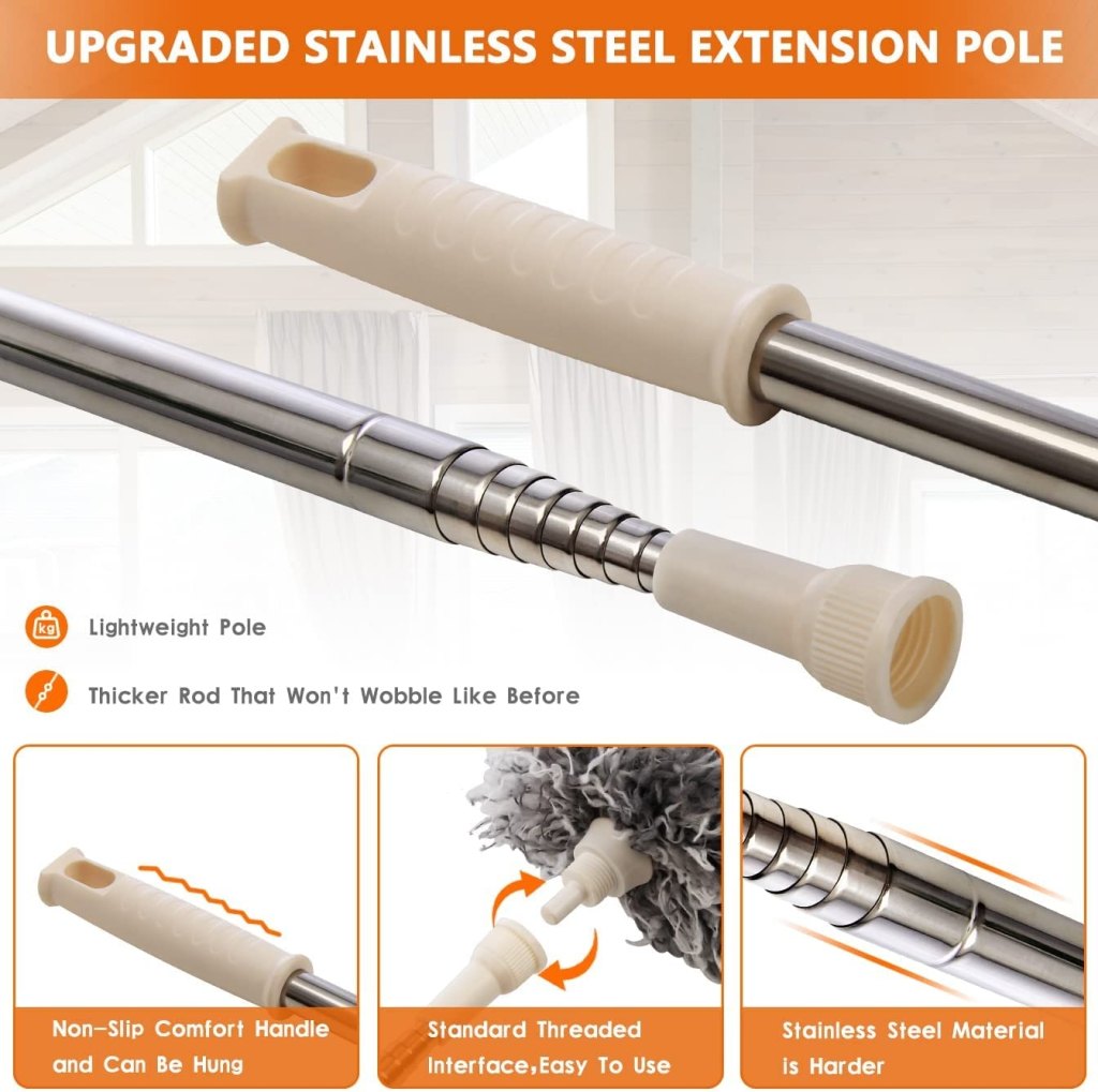 Extra-Long Extendable Pole: Stainless steel telescopic pole extends from 30" to 100", allowing safe access to high areas like ceiling fans, shelves, and windows.