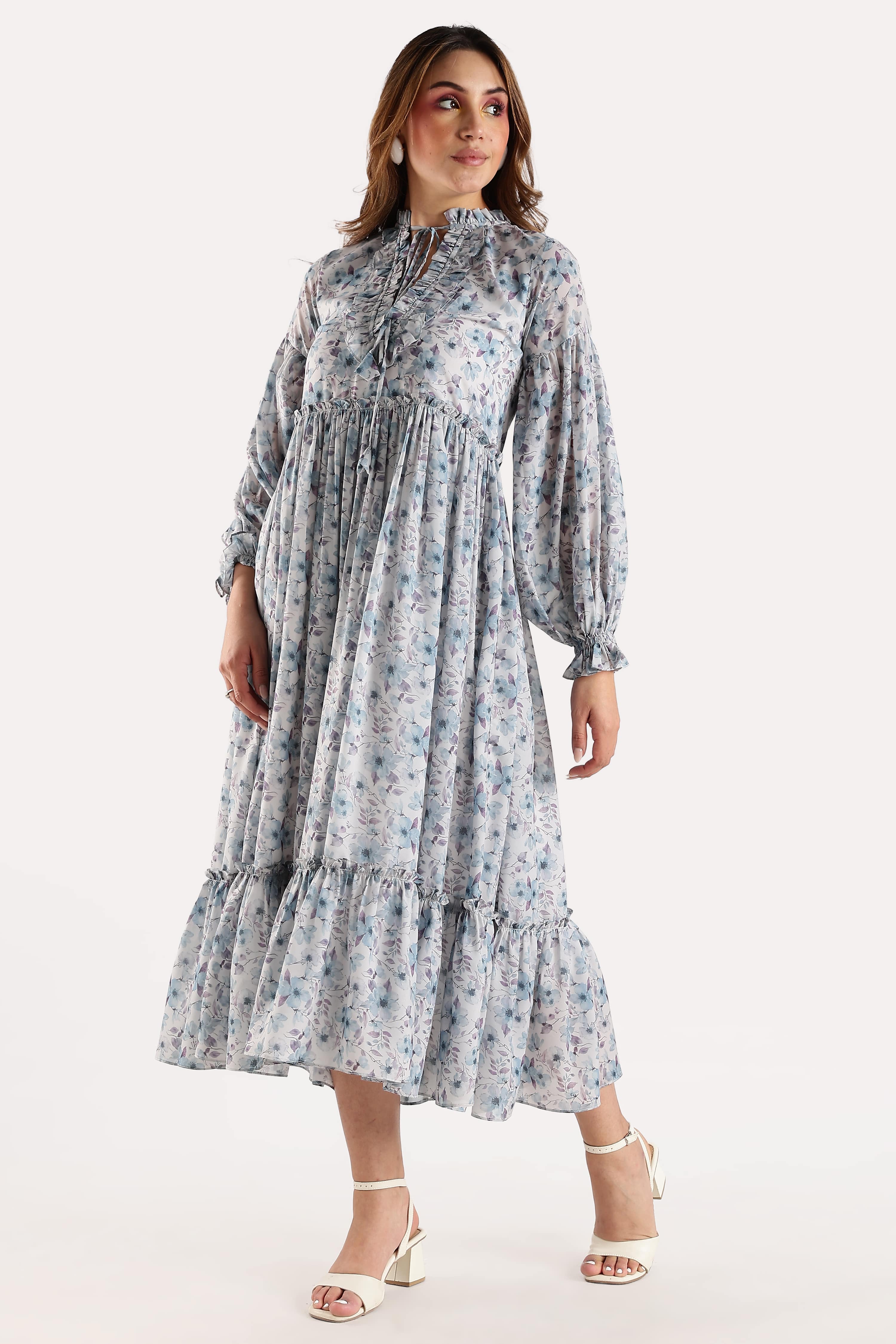 Embrace Elegance With This Floral Printed Dress Featuring A Ruffled V Neckline. Perfect For Effortless Style And Comfort.