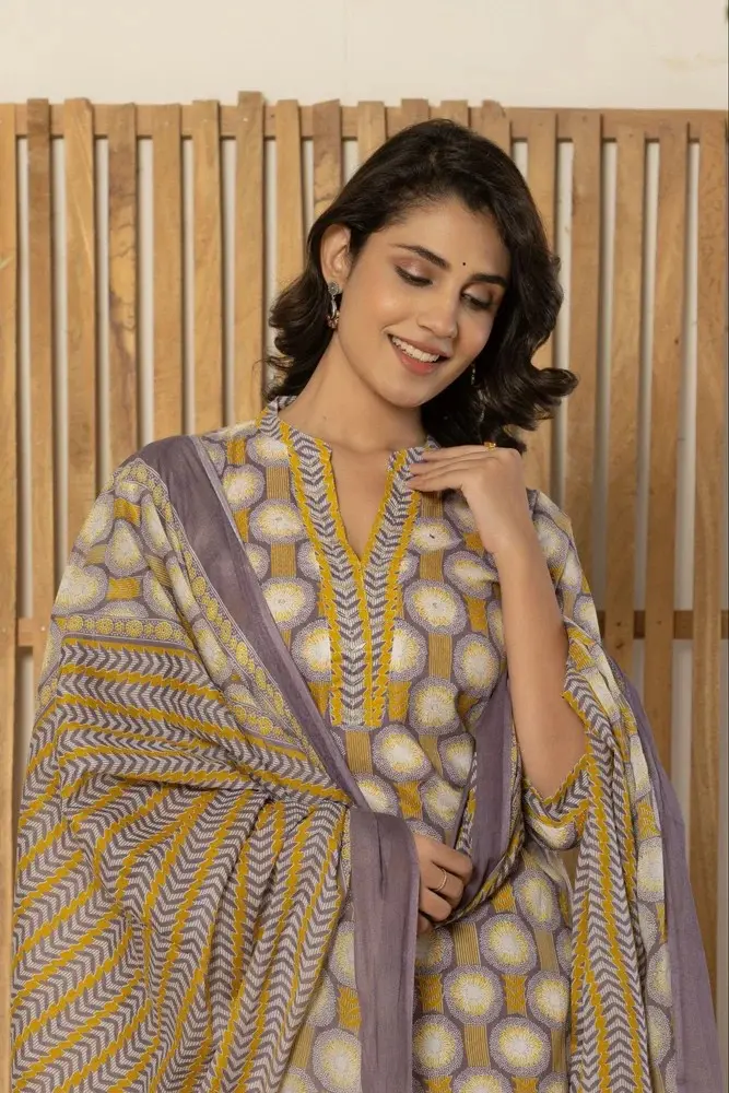 Brings to you this beautiful Printed Straight Kurta with Palazzos and Dupatta which is made from Cotton fabric with beautiful print all over.This kurta set has been designed keeping in mind the latest trends in contemporary casual fashion. The dress combines ethnic with the fashion of today and makes you stand out among others when you adorn it.This sets are ideal for warm weather, ensuring you stay cool while looking stylish.