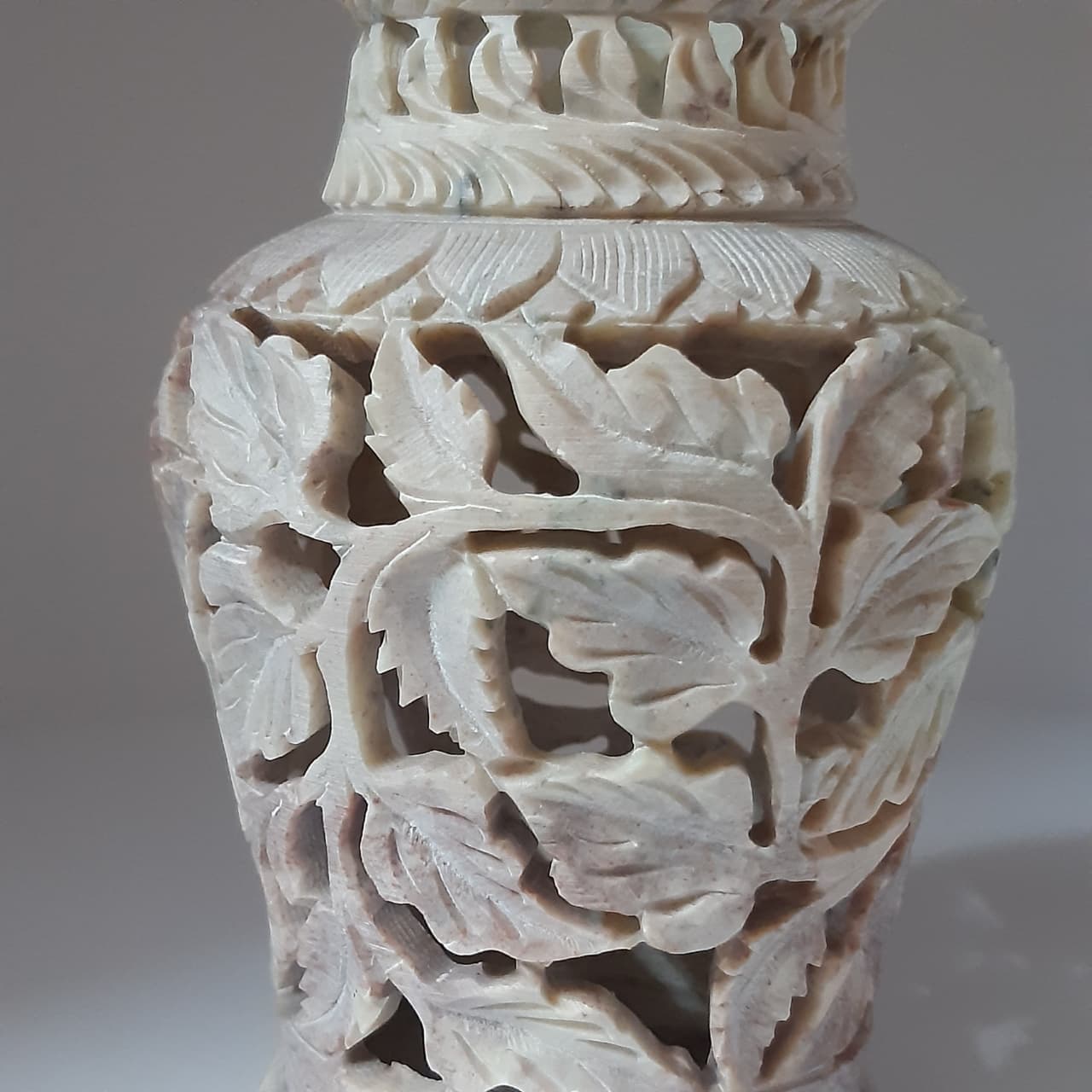 Add a touch of timeless elegance to your space with this 6-inch Soapstone Marble Flower Vase, beautifully handcrafted by skilled artisans. The vase features intricately carved leaves and floral patterns, showcasing the natural beauty and fine detailing of genuine soapstone marble.Perfect as a home décor accent, it enhances any room with its artistic charm — whether displayed on a console, coffee table, or mantel. This exquisite piece also makes a thoughtful gift for housewarmings, weddings, or festive occasions.