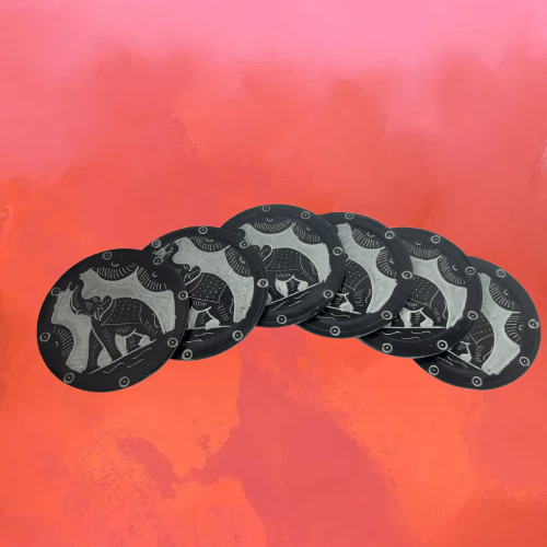 Bring a touch of artistry and tradition to your table setting with this elegant Black Round Elephant Engraved Marble Coaster. Handcrafted from premium quality marble, this coaster showcases a finely detailed elephant motif — a symbol of wisdom, strength, and good fortune.The smooth, polished surface not only enhances your décor but also protects your furniture from spills and stains. Its intricate hand-carved design and contrasting black-and-grey finish make it a timeless piece of craftsmanship that reflects Indian heritage.Perfect for daily use or as a thoughtful gift, this coaster adds sophistication to tea-time moments, office desks, or festive gatherings. Coasters Dimension : 3 Inches Diameter