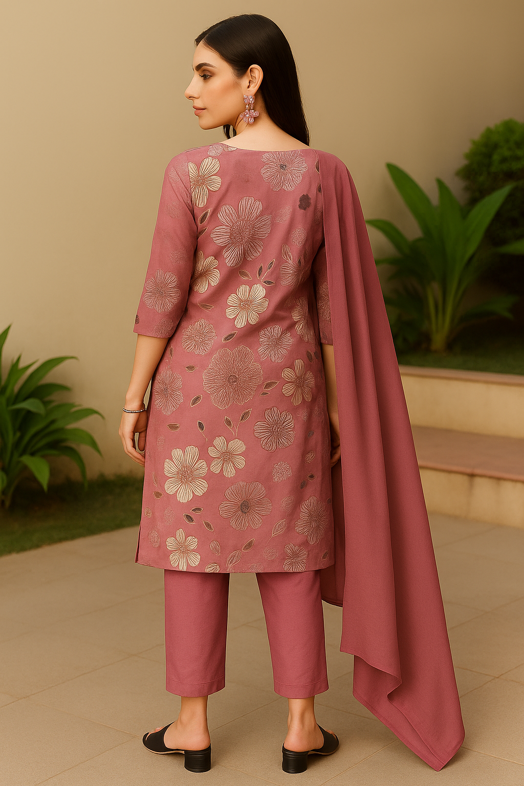 Dusty Rose Floral Printed Kurta Set with Solid Dupatta
