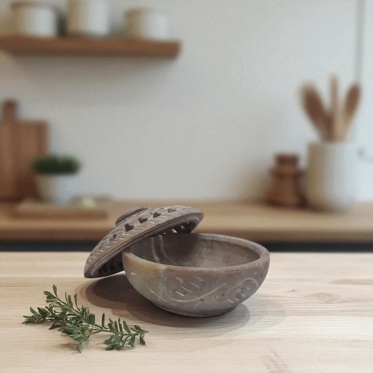 Handcrafted Soapstone Potpourri Jar – Elevate your home décor with this intricately carved round soapstone jar featuring delicate floral motifs. Its natural stone texture and fine detailing add an elegant, earthy charm to any space. Perfect for storing potpourri, small trinkets, or simply as a decorative accent for living rooms, bedrooms, or office tables. A beautiful blend of traditional craftsmanship and modern minimalism, it also makes a thoughtful gift for housewarmings, weddings, and festive occasions.