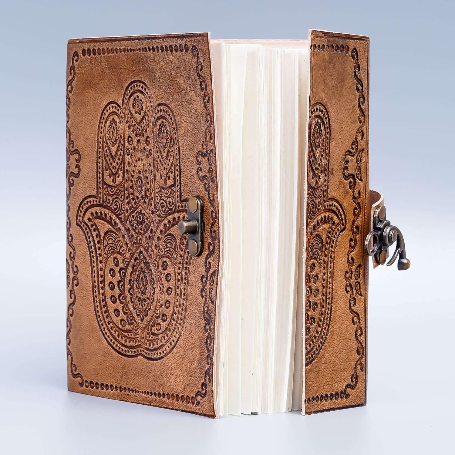 Beautiful & Aesthetic: Handmade leather book journal - use it as scrapbook or sketch book to draw, stick travel photos to make collage, practice Calligraphy using fountain pen, paint your dream using a paint brush and do not worry as we use no-bleed through thick craft pages. Best hand-crafted gift for an Art lover. Carry in style and get compliments wherever you may go, Compliments GuaranteedWrite Travel Stories: Save the beautiful moments shared with your loved one travelling around your favorite places & experience when you read them later in timeThis daily diary can be an easy conversation starter in your new college or university.It is compact sized so you can write wherever you are and can easily fit into a purse or backpack, can carry to your next vacation tripAdd Creativity: Use different color pens, pencil, fountain pen, watercolor, roller gel pen, highlighter. We use no-bleeding unlined smooth cotton craft environment friendly paper, with a vintage look which can be used by scribblers, amateur poets, writers & professional artists. Write your very own home brew recipesThis premium rustic and vintage handmade leather bound small, thick and unruled old style aesthetic leather notebook & personal diary with unique design and leather journal can be use in your next travel for adventure writing, music writing, agenda notepad for office meeting, business trip, day to day activity planner, personal organizer, capturing old memories, secrets, ancient stylish art and craft painting book, journaling and fancy photoshoots. Best Choice for Gift