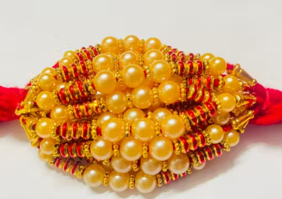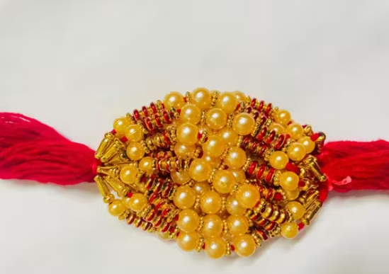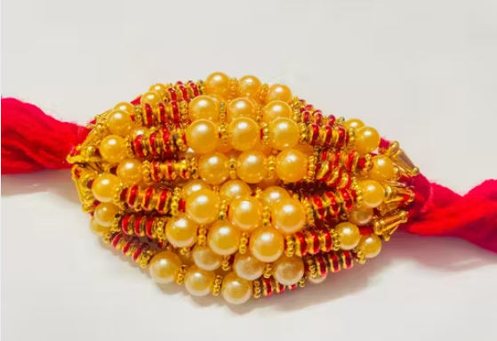 Celebrate the sacred bond of love and protection with this beautifully handcrafted Pearl Beaded Rakhi. Designed with elegant white pearls, golden accents, and vibrant red-yellow threads, this Rakhi perfectly blends tradition with modern charm. Its exquisite detailing adds a touch of grace, making it an ideal choice to express your heartfelt affection on Raksha Bandhan.