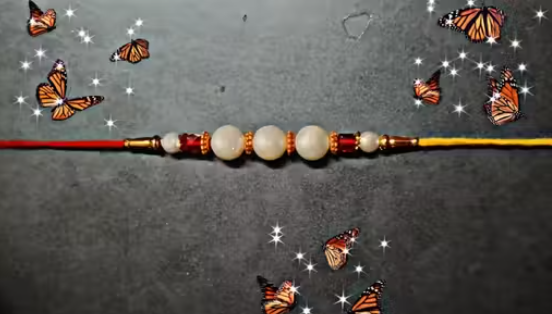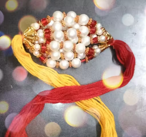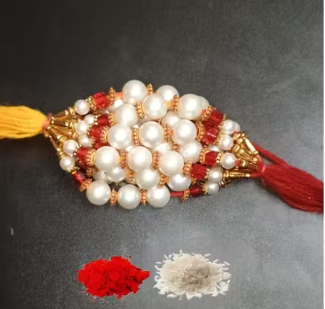 Celebrate the sacred bond of love and protection with this beautifully handcrafted Pearl Beaded Rakhi. Designed with elegant white pearls, golden accents, and vibrant red-yellow threads, this Rakhi perfectly blends tradition with modern charm. Its exquisite detailing adds a touch of grace, making it an ideal choice to express your heartfelt affection on Raksha Bandhan.