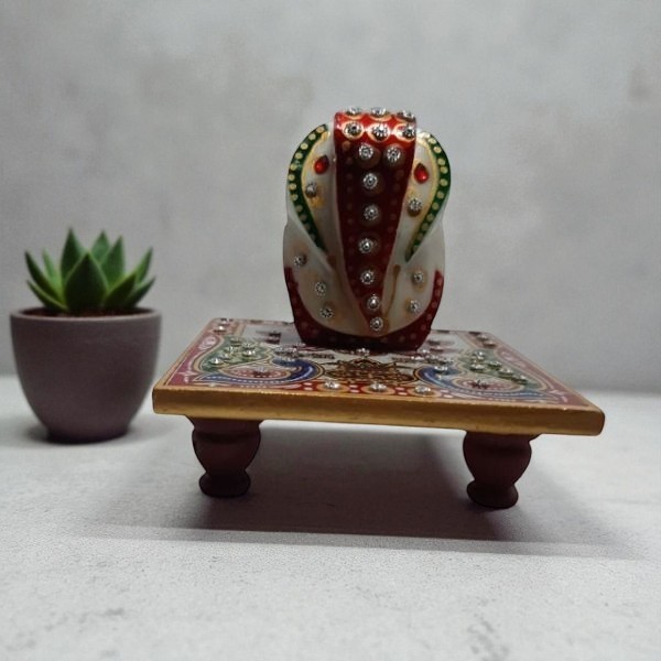Elegant Handcrafted Marble Ganesha Idol with Decorative Chowki – Bring home blessings and festive charm with this beautiful marble Lord Ganesha idol. Adorned with sparkling stones and intricate traditional artwork, it sits on a vibrant multicolored chowki with fine detailing. Perfect for pooja rooms, festive décor, gifting, or as a centerpiece for special occasions. Add a touch of spirituality and elegance to your home or office décor. Ideal gift for Diwali, Ganesh Chaturthi, housewarming, or weddings.