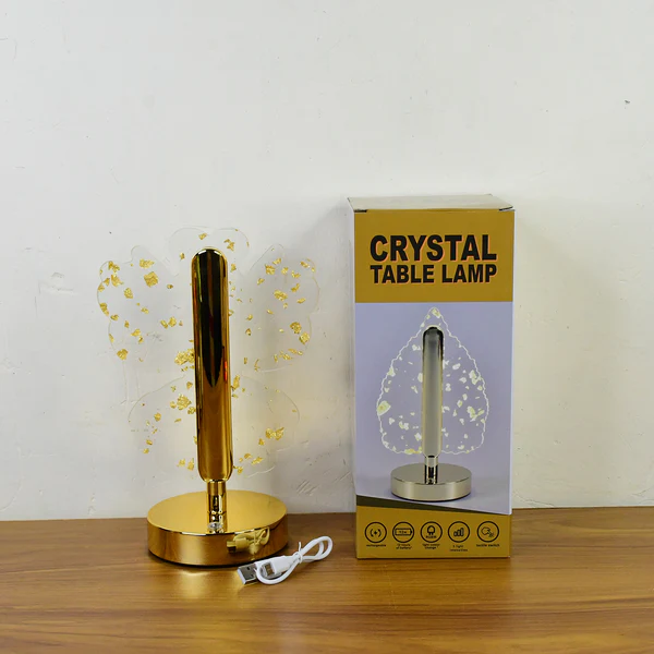 Add elegance and charm to your home with this Butterfly-Shaped Crystal LED Table Lamp, designed with a premium golden metallic base and an acrylic crystal-effect shade filled with golden flakes. The unique butterfly silhouette beautifully diffuses warm LED light, creating a luxurious and cozy ambiance. With USB recharging capability and energy-efficient lighting, this lamp is both stylish and practical, making it a must-have for modern interiors and festive decorations.Key Features :-Unique Butterfly Design: Acrylic shade shaped like butterfly wings with embedded golden flakes.Golden Base: Sturdy metallic base adds luxury and durability.Warm LED Glow: Soft illumination creates a cozy and premium atmosphere.USB Rechargeable: Convenient charging for eco-friendly, long-lasting use.Energy Efficient: LED technology ensures long lifespan and low power consumption.Multi-Purpose Use: Suitable for everyday lighting as well as decorative purposes.Perfect Gift Option: Ideal for festivals, weddings, birthdays, and home décor lovers.Ideal For :-Bedside night lamp for bedrooms.Decorative centerpiece for living rooms, dining areas, and offices.Festival and event décor (Diwali, Christmas, Parties).Romantic lighting for special occasions.Elegant gift for housewarmings, weddings, and anniversaries. Use: Diwali Decoration, Diwali Item, Festive Decoration, Ganpati Decoration, Ganesh Decoration, christmas, new yearSpecifications :-Product Type: Crystal LED Table LampDesign: Butterfly-shaped acrylic shade with golden flakesBase Material: Golden metallic finishLighting Type: LED lightPower Supply: USB rechargeableUsage: Indoor decorative and functional lightingPiece Count: 1 PcKeywords :-crystal table lamp, LED table lamp, rechargeable lamp, decorative table lamp,touch control lamp, night lamp,bedroom decor, living room decoration,gift lamp,luxury table lamp, modern crystal LED lamp,artistic design lamp, stylish table lamp, golden base lamp,decorative crystal night lamp, premium room decor lampDimension:- Vol. Weight (Gm) :- 490 Product Weight (Gm) :- 233 Ship Weight (Gm) :- 490 Length (Cm) :- 24 Breadth (Cm) :- 10 Height (Cm) :- 10