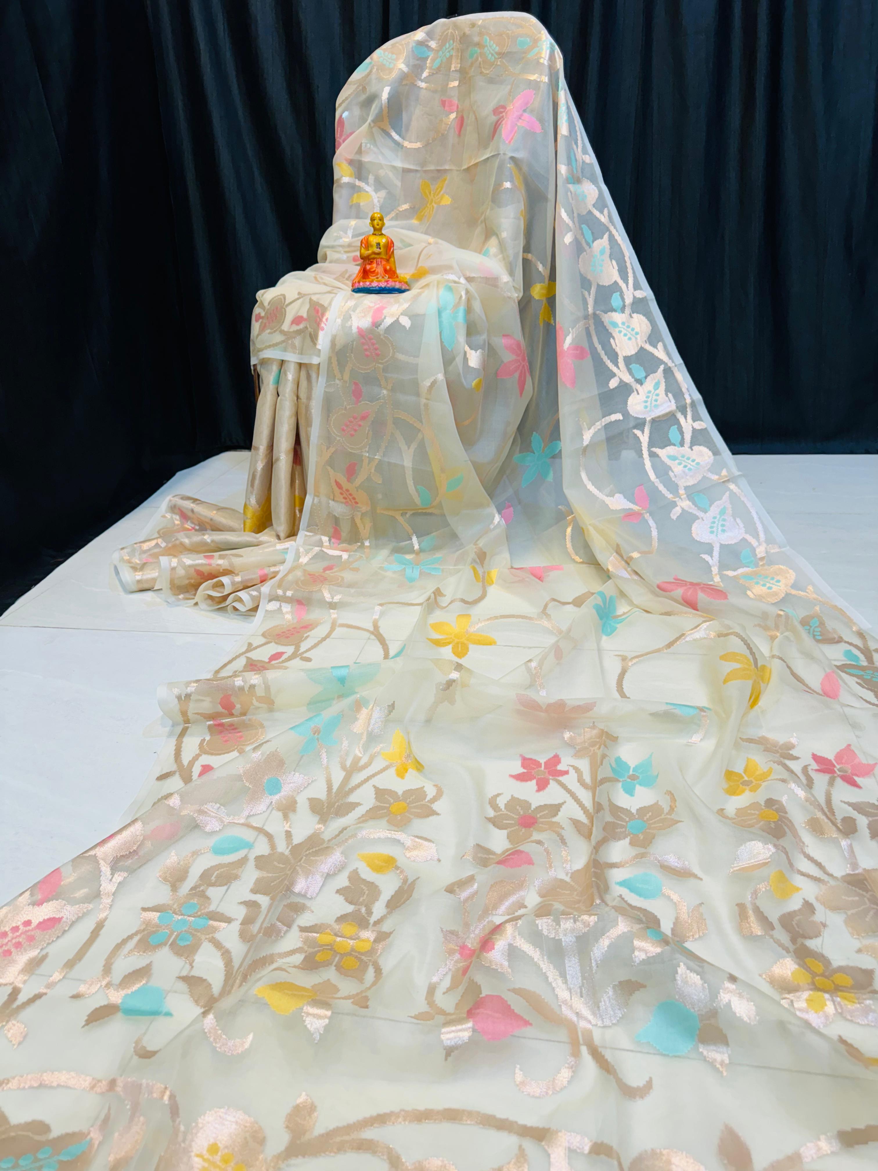 Elevate your ethnic wardrobe with this exclusive pure muslin saree, exquisitely handcrafted to perfection. Crafted from premium-quality lightweight muslin fabric, this saree features delicate floral in vibrant pastel shades, adding a touch of charm and grace to your look.Work: Intricate Floral WeavingTexture: Soft, Sheer & BreathableIdeal for: Festive Occasions, Day Events, Summer Weddings, and Elegant Gatherings