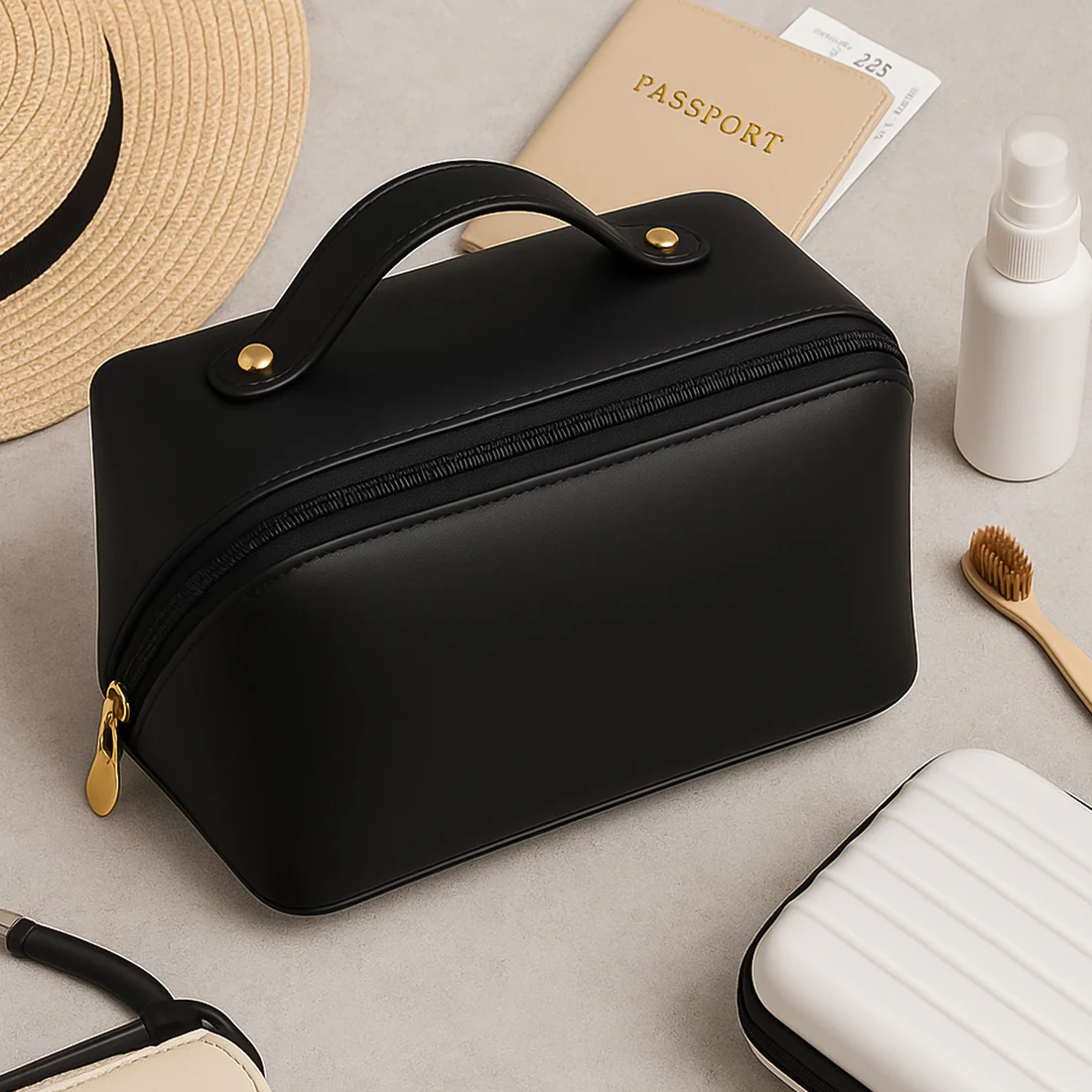 Equipped with a full-length zipper and a secure carrying handle, the pouch opens wide for easy access to contents. The internal compartments are thoughtfully designed to hold bottles, brushes, makeup kits, creams, deodorants, and even small electronics or grooming tools. Its minimalist yet elegant black finish makes it perfect for both men and women.