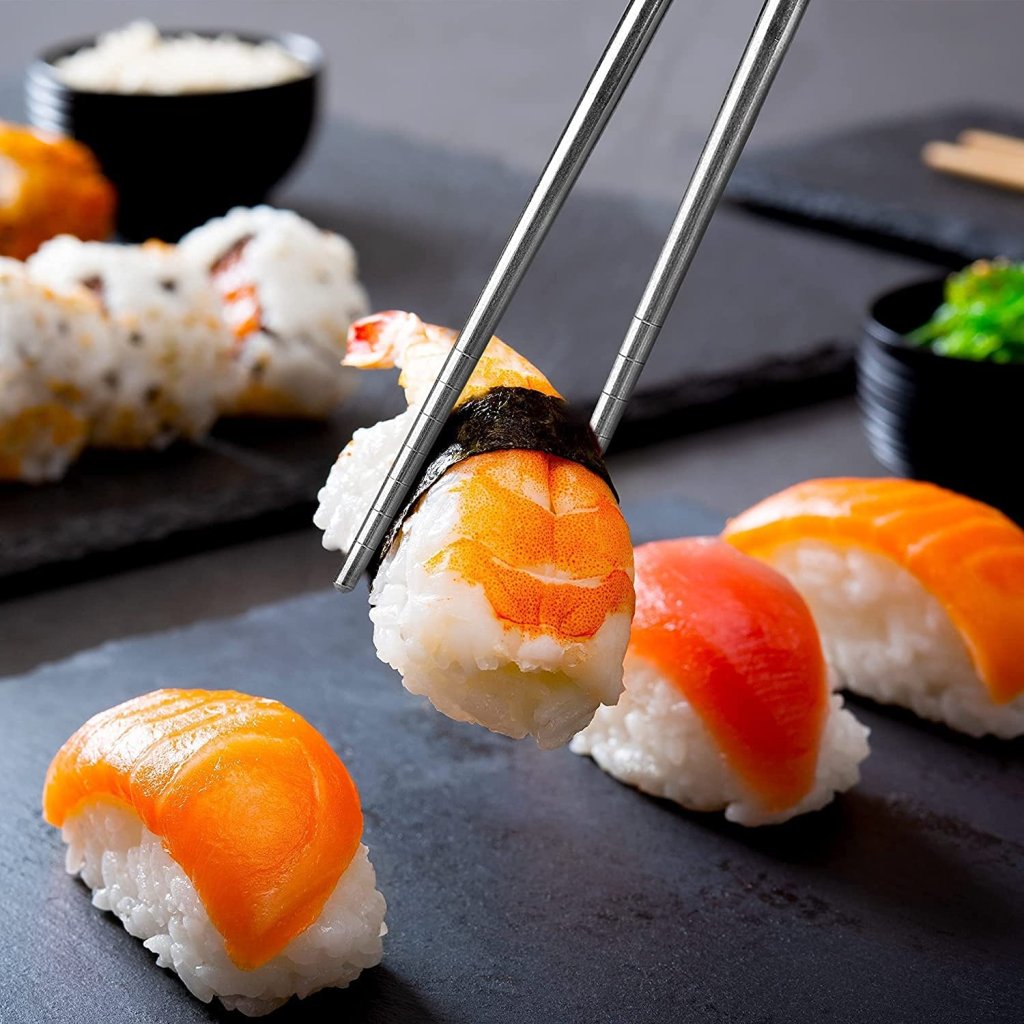Unlike wooden or bamboo chopsticks, these stainless steel ones do not bend, crack, or retain food odor. They are long-lasting, reusable, and environmentally friendly.
