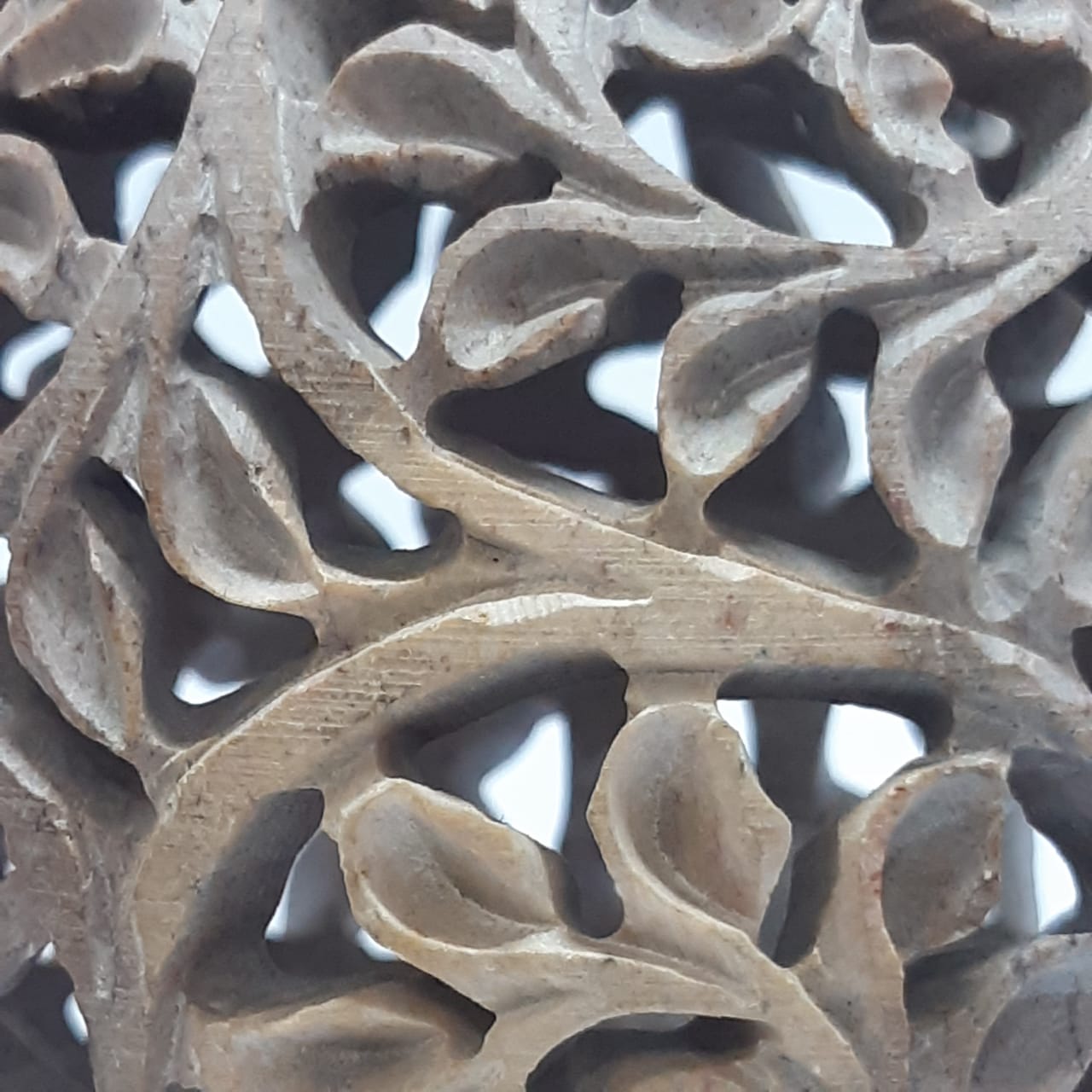 Bring an elegant touch of craftsmanship to your home with this intricately hand-carved soapstone sphere.Material: Natural soapstone with a smooth, earthy finishDesign: Detailed latticework featuring delicate floral and leaf motifs, allowing soft light to filter throughUses: Perfect as a tealight holder, decorative accent, or centerpiece for living rooms, kitchens, and patiosSize: Compact and versatile to suit shelves, tables, or countertopsEach piece is uniquely handcrafted, making it a timeless addition to any décor and a thoughtful gift for art lovers.