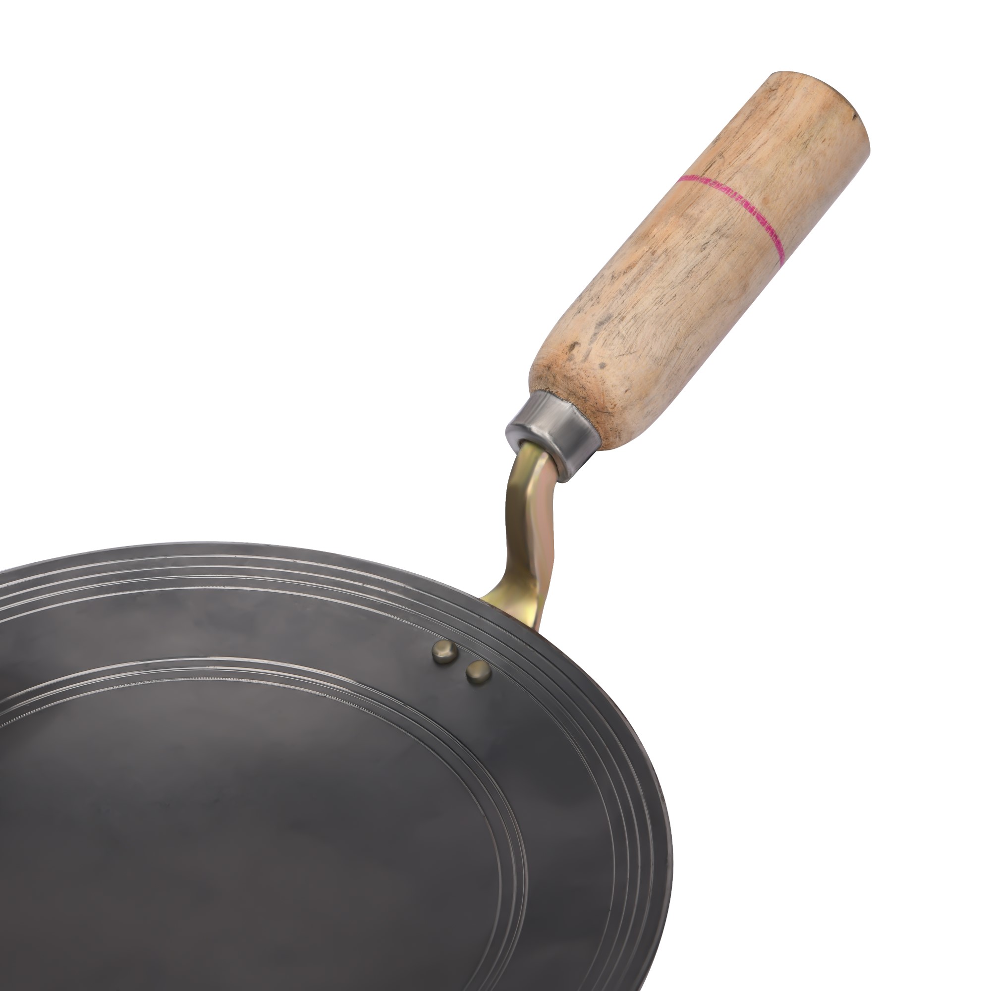 VISMAY's Traditional Pure Iron Tawa is a testament to craftsmanship, blending heritage with functionality for an exceptional cooking experience. Crafted from high-quality pure iron, this Tawa is meticulously hammered to perfection, enhancing its durability and ensuring even heat distribution. The unique surface not only adds to its aesthetic appeal but also helps in preventing food from sticking, resulting in perfectly cooked Rotis and Chapatis with a delightful texture. Measuring 9.5 inches in diameter, this Tawa offers ample space for cooking single portions, making it ideal for smaller households or individual servings. The inclusion of a wooden handle adds a touch of tradition while providing a comfortable grip and heat insulation, ensuring safety during use. The pure iron construction of this Tawa makes it compatible with various cooking surfaces, including gas stoves, electric cooktops, and induction cookers. Additionally, its non-toxic nature ensures a healthier cooking experience, free from harmful chemicals or coatings. Experience the artistry of traditional cooking with VISMAY's Pure Iron Hammered Tawa, and elevate your culinary creations to new heights. Whether you're preparing Rotis, Chapatis, or any other flatbreads, this Tawa promises to deliver exceptional results, making it a prized possession in any kitchen. Embrace tradition while embracing quality with VISMAY's Hammered Tawa.