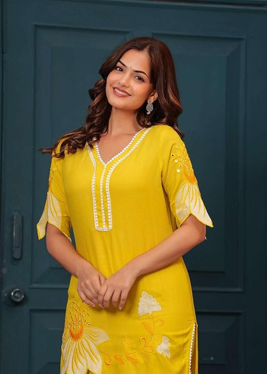Comfortable & Relaxed Fit: Designed with a flattering straight Anarkali A- Line Nayra-cut Kurti kurta Suit and relaxed-fit Salwar palazzo pants for ultimate comfort and ease of movement.