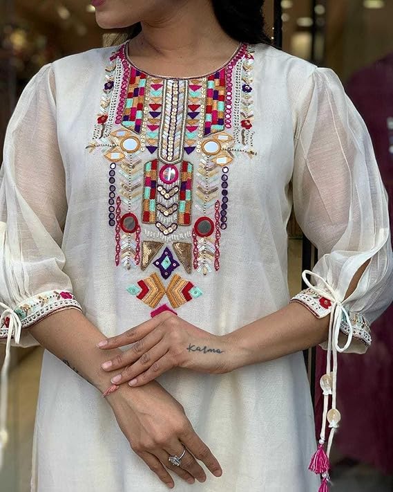 Women's Cotton Mirror Work Embroidered Straight Kurti with Pant and Dupatta Set