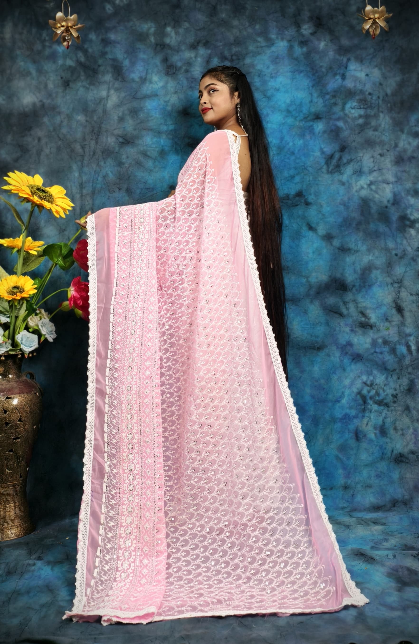 Grace your wardrobe with this Beautiful Hakuba Saree, designed in a soothing pastel pink shade with intricate white thread embroidery. Crafted from premium-quality lightweight fabric, it offers a soft, luxurious drape with exquisite detailing—perfect for weddings, festive occasions, parties, and elegant get-togethers. A timeless blend of sophistication and craftsmanship, this saree makes every moment memorable with its refined beauty and premium finish.